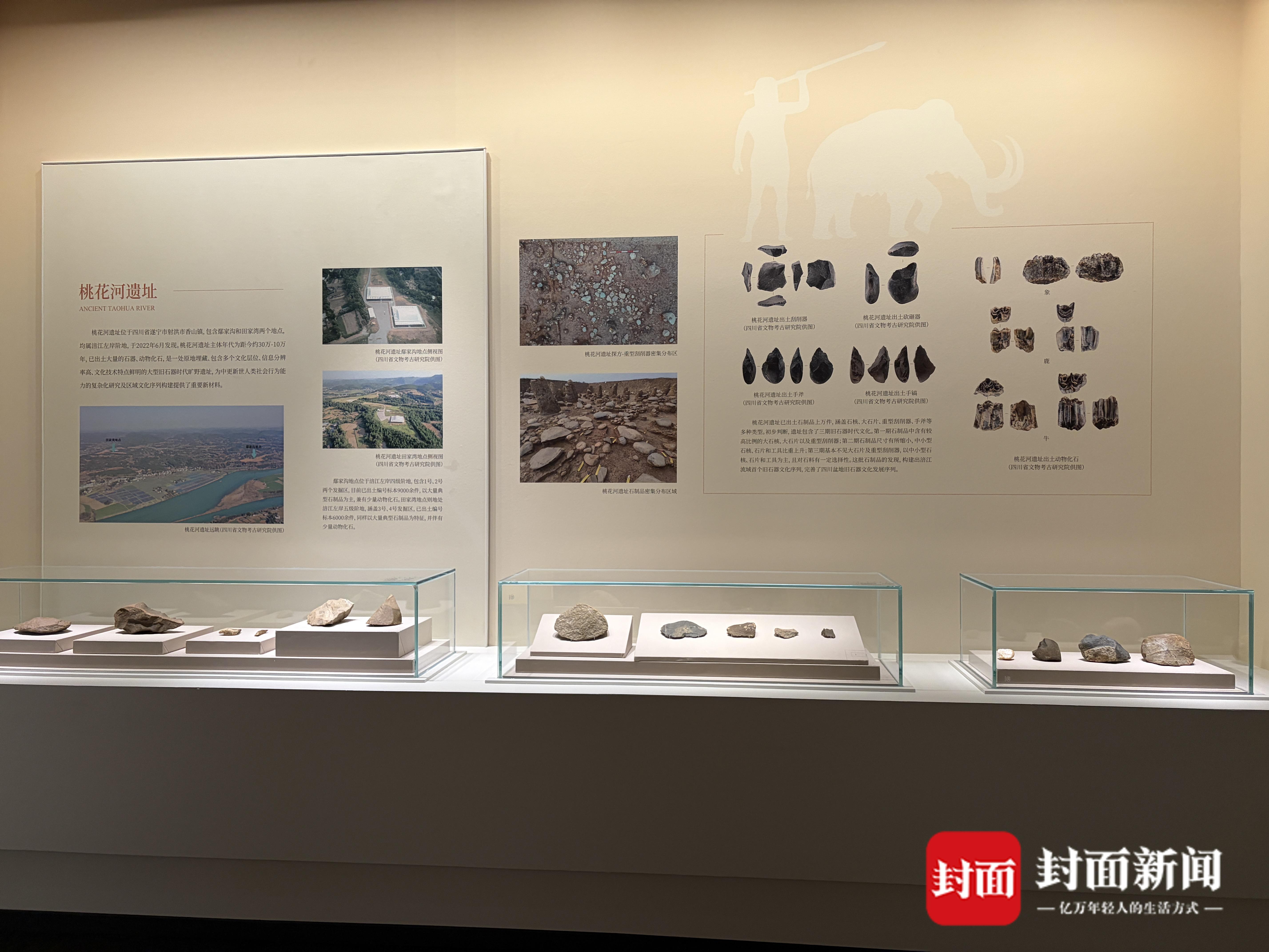 在第一个单元,能看到遂宁早期的历史遗存。其中,位于遂宁市射洪市香山镇的桃花河遗址,该遗址的部分出土石制品为首次展出。“根据研究分析,桃花河遗址的主体年代距今约30万—10万年。这些遗存也证实,遂宁市在数十万年前就已经有人类活动的踪迹。”